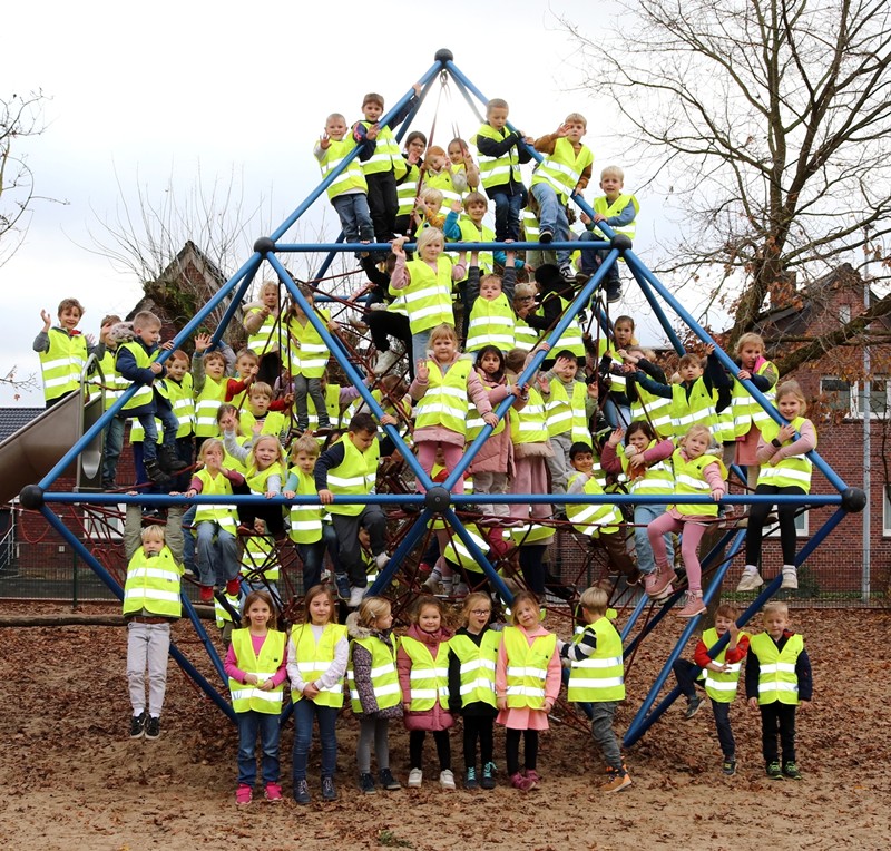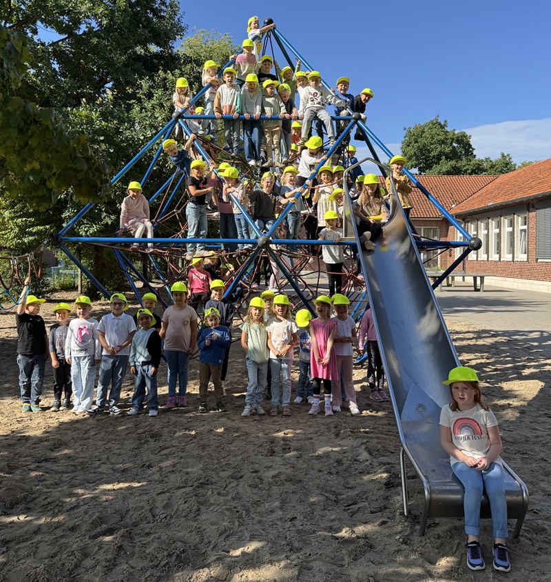 Schon direkt nach der Einschulung erhielten die Kinder Im Rahmen der kreisweiten Verkehrssicherheitsaktion „Kreis Steinfurt sieht gelb“ ihre leuchtend gelben Käppies – ein erstes sichtbares Zeichen dafür, wie wichtig Sicherheit auf dem Schulweg ist. In der vergangenen Woche folgte dann die ergänzende Ausstattung mit reflektierenden Sicherheitswesten, die die Erstklässler stolz auf dem Schulhof präsentierten.