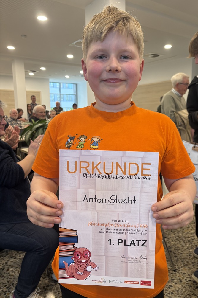 Die ehemalige Schulleiterin, Angelika Fenk-Stein, die am Freitag leider verhindert war, schrieb am Freitagmorgen noch eine Nachricht: „Anton ist ein toller Leser mit guter Betonung – und er ist ein kerniger Typ!“ Und sie hatte recht: das Gesamtpaket stimmte: selbstbewusstes Auftreten, knalliges Schul-T-Shirt, ein lustiger Lesebeitrag vom „dicken grauten Schinken“, ein flüssiger Lesevortrag mit perfekter Betonung, eine anwesende Fanschar mit Großmüttern, Familie, Heimatverein und weiteren Unterstützern aus der Ludgerischule.